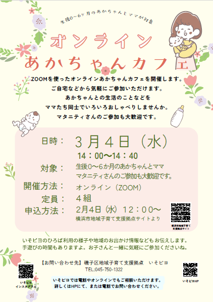 | 概要 | ZOOMを使ったオンラインあかちゃんカフェを開催します。ご自宅などから気軽にご参加いただけます。 あかちゃんとの生活のことなどをママたち同士でいろいろおしゃべりしませんか。マタニティさんのご参加も大歓迎です。 |