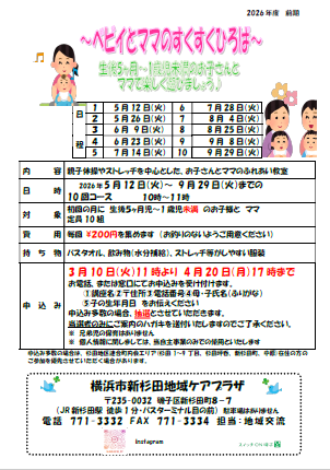 | 申込方法 | 3月10日(火)11時より、4月20日(月)17時まで 電話・窓口にて受付 ①講座名 ②〒住所 ③電話番号 ④母・子の名前 ⑤子の生年月日 をお伝えください。 申込み多数の場合は『抽選』 当選者にはがきを送付します。 |