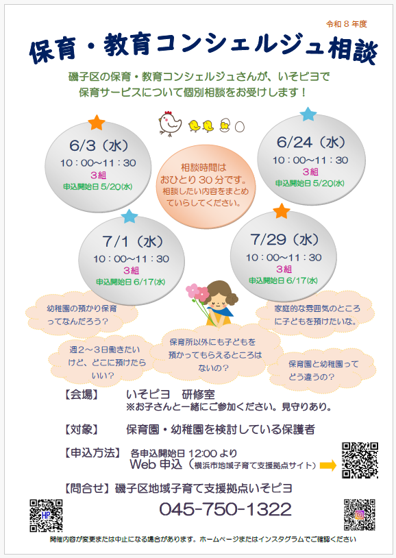 概要 磯子区の保育・教育コンシェルジュによる保育サービス(保育園・幼稚園情報など)についての個別相談です。