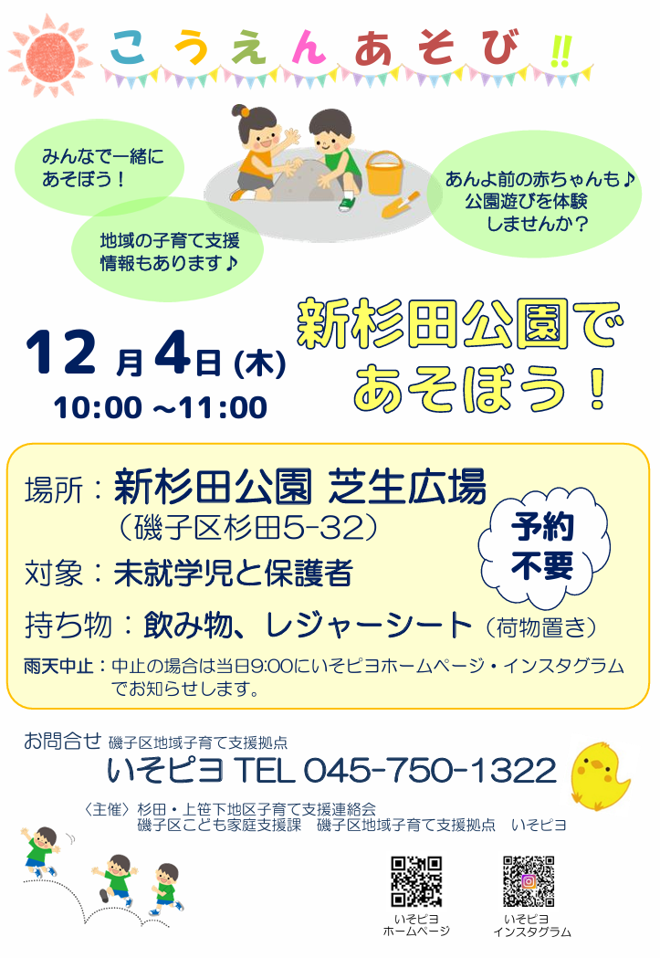 | 概要 | 新杉田公園芝生広場でみんなで遊びましょう。 地域の子育て支援情報もあります。あんよ前のあかちゃんも公園遊びを体験しませんか? |