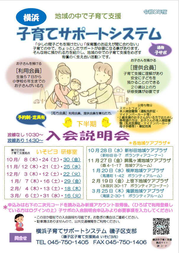 | 問合せ | 横浜子育てサポートシステム磯子区支部 045-750-1405 |
