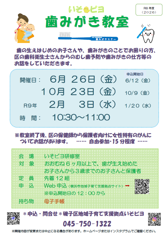 | 概要 | 歯の生えはじめのお子さんや、歯みがきのことでお困りの方、区の歯科衛生士さんから虫歯予防や歯みがきの仕方等のお話をしていただきます。 |