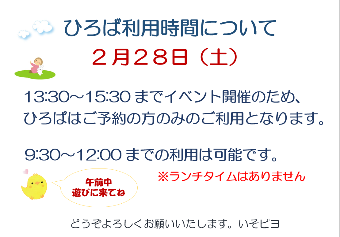 2/28(土)ひろばは午後イベントのためひろばは9:30~12:00までのご利用となります。 ランチタイムはありません。
