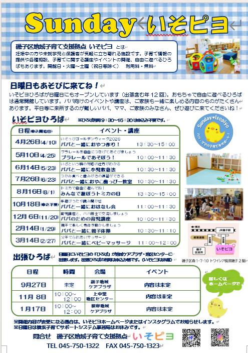 開所時間、イベントの詳細や申し込みなど、詳しくは「いそピヨカレンダー」でご確認ください。